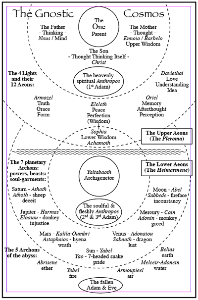 three baptisms, <secret names and signs will be entrusted to you - first of all, for the renunciation of the lords of the Lower Aeons, and secondly, for the invocation of the angels who dwell in the Upper Light.> (Gs Egypt 63:4) "But the names which I give you shall be spoken by you once only. The renunciation and invocation are rites of naming - and the hidden names, once spoken, grant existence to what is named. Indeed, <all that exists, exists through its name.>" (Tri Tr 61:12) Philip and Nathanael gazed inward. Each was trying to comprehend the mysteries within the mysteries, like so many layers of knowing. The saviour, meanwhile, was staring into the invisible heavens, remembering the mystery that had manifest itself before the foundation of the world. "<The unproclaimable Parent> (Gs Egypt 41:4) exists in the great Silence. <He is the Parent whose name cannot be uttered.> (Gs Egypt 40:16) But when He named himself with the names of the Mother and the Father, these two came to exist - as extensions of the One, as aeons expanding outward in circles, but remaining one in their centre. Each name in the Upper Aeons, spoken with the pneuma's breath, reflects the One back to itself - in name. "All the aeons possess these hidden names. Even you, through the baptism and chrism, come to possess such a name: it is your hidden spiritual name, <a name that the Father himself pronounces> (Gs Tru 21:27) when you are sealed in the watery light and <inscribed in the Book of the living.> (Gs Tru 21:25) Thus you are made one of the Elect, one of the living who truly exists." Looking into the blazing fire, Jesus said: "Even the twelve Archons have their names <- names given to them by their Originator, to extend his darkening power. But the Archons |